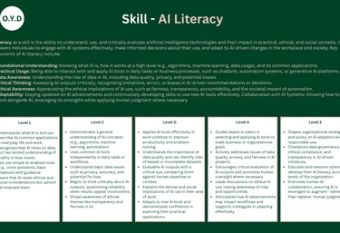 Why 5? Five offers the optimal balance, comprehensive enough to capture meaningful progression, yet focused enough to remain practical. When we partner with your organisation, these skill definitions and levels become the foundation of your bespoke skills ontology, tailored to reflect your unique strategy, culture, and capability goals