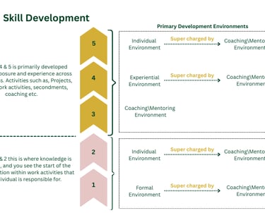 Levels 3 to 5 shift toward exposure, experience, and strategic impact, driven by Experiential and Coaching/Mentoring environments that challenge individuals to apply, adapt, and lead.