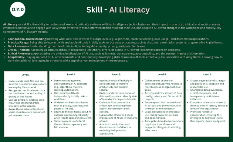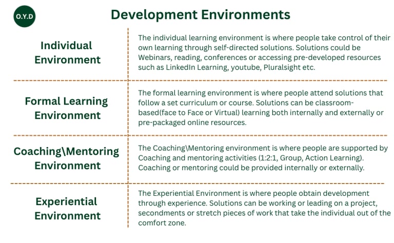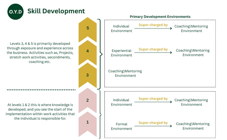 At O.Y.D, we champion a progressive layering approach to skills development, one that aligns with how people truly learn, grow, and perform. Our five-level framework maps the journey from foundational knowledge to strategic capability, blending four core development environments: Individual, Formal, Coaching/Mentoring, and Experiential.