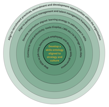 Establish a shared language of skills across the organisation by creating a skills ontology that reflects strategic priorities, cultural values, and future capability needs. This foundation enables consistent classification, measurement, and development of skills across roles and functions.